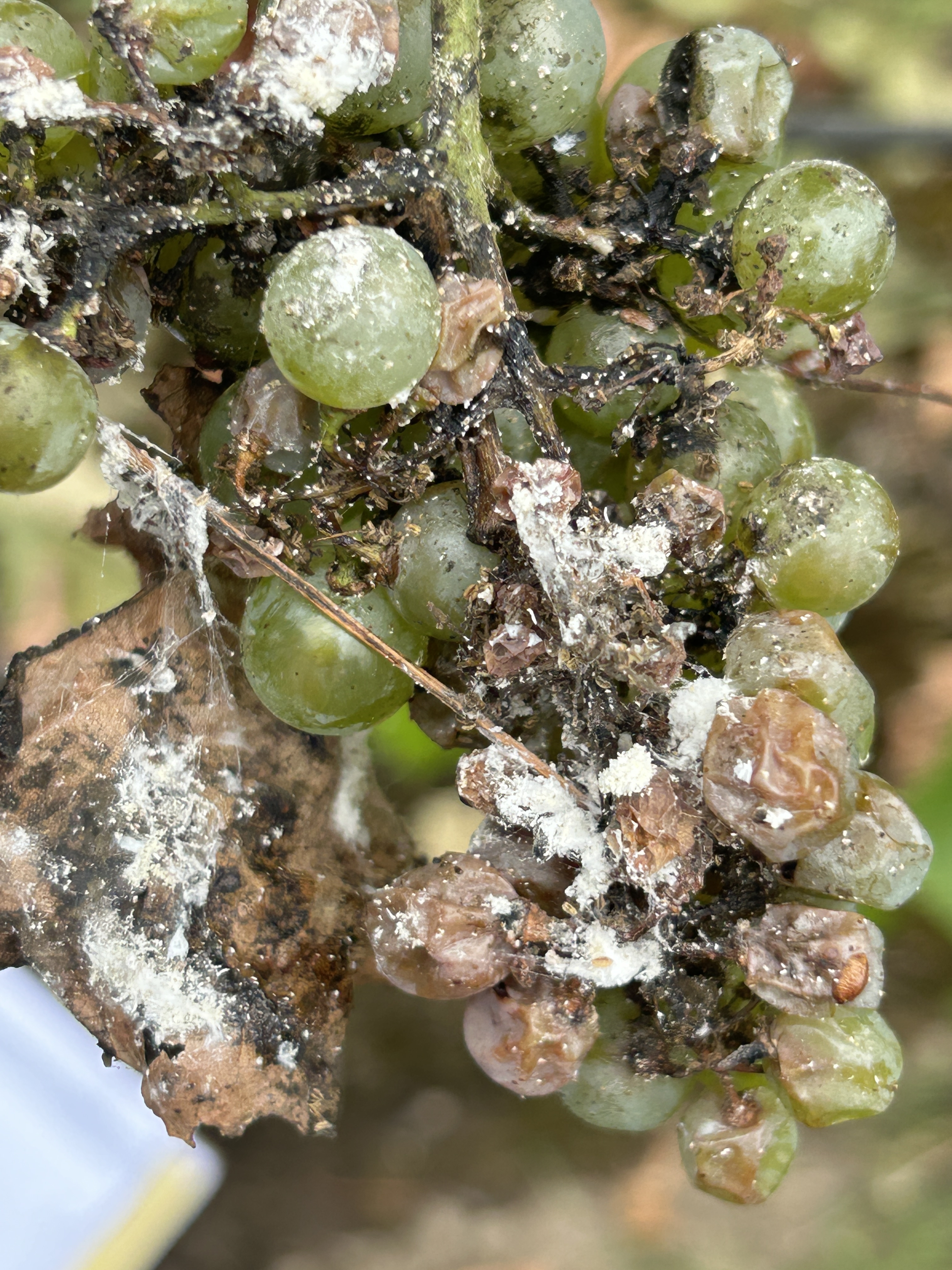 Powdery mildew, downy mildew, and botrytis are significant grapevine diseases that can impair vineyard health and reduce marketable grape yields. Powdery mildew, caused by the fungus Erysiphe necator, forms white powdery patches on leaves, affecting photosynthesis. Downy mildew, attributed to the fungal-like oomycete Plasmopara viticola, triggers yellow spots on leaves, which can develop into a white down on unprotected green tissue leading to significant bunch losses and contractual downgrades. Botrytis cinerea, responsible for botrytis bunch rot, is a necrotrophic fungus that thrives in humid conditions, causing grey mould on grapes. These diseases disrupt grape maturation, impact fruit and wine quality, and require vigilant monitoring.
