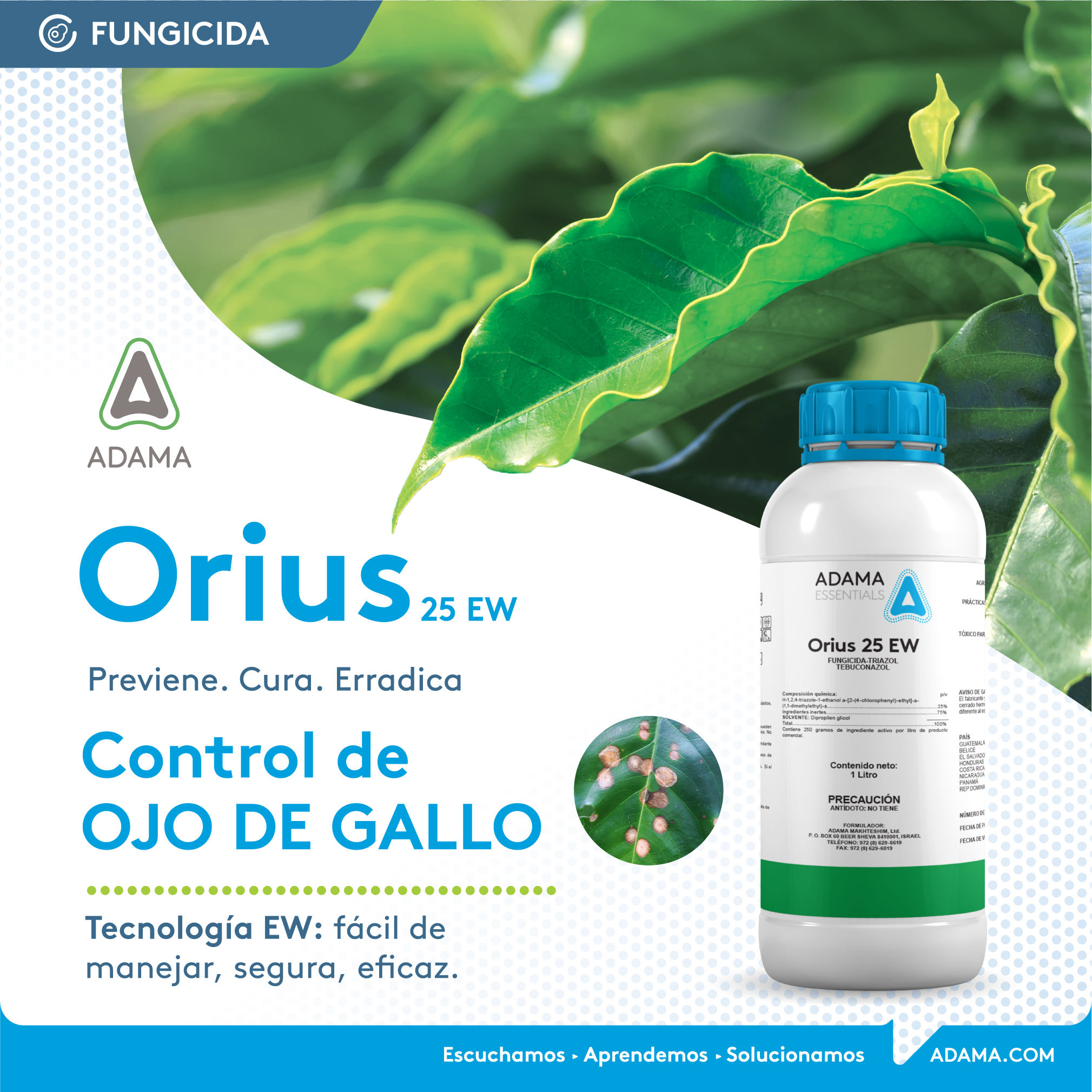 Orius 25 EW es un fungicida sistémico de amplio espectro que actúa de forma preventiva, curativa y erradicante. Es una herramienta ideal para agricultores que enfrentan problemas como roya del café, antracnosis en aguacate, tizón temprano en tomate o ojo de gallo en cafetos, especialmente durante épocas lluviosas o de alta humedad.
