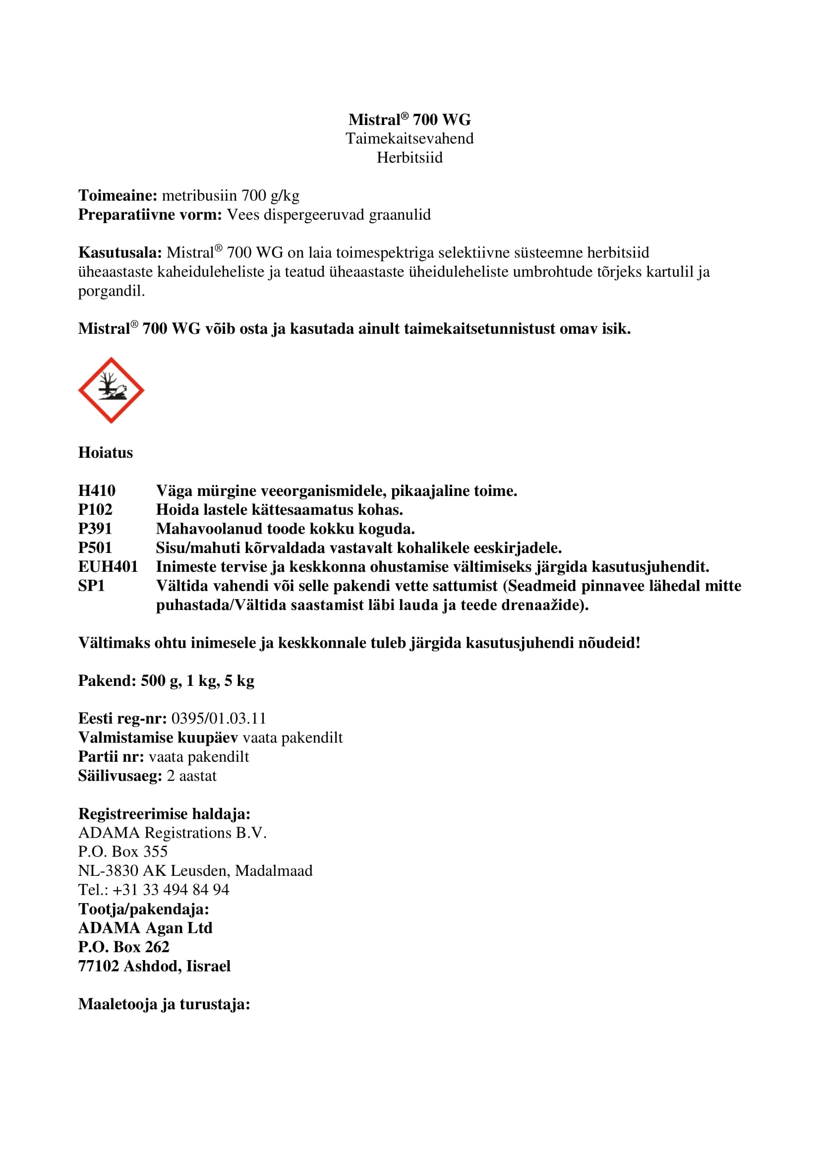 Mistral® 700 WG – laia toimespektriga selektiivne süsteemne herbitsiid üheaastaste kaheiduleheliste ja teatud üheaastaste üheiduleheliste umbrohtude hävitamiseks kartulikasvatuspiirkondades.