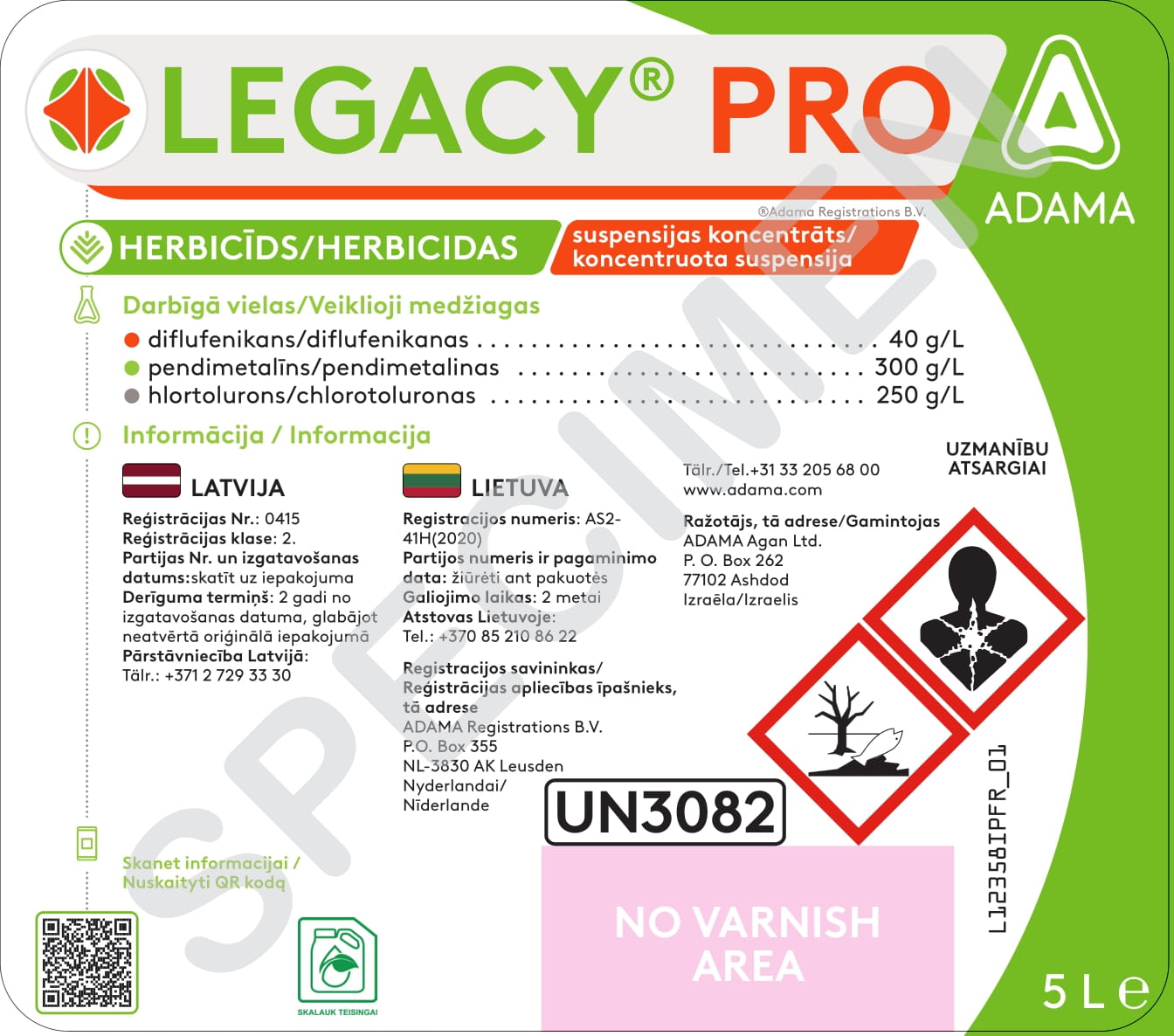 Trīs dažādu darbīgo vielu kombinācija nodrošina herbicīda iedarbību uz plašu nezāļu spektru, augstu preparāta efektivitāti, kā arī samazina nezāļu rezistences veidošanās risku. Visas darbīgās vielas ir sistēmas un augsnes iedarbības, ko augi absorbē caur saknēm, dīgstiem un lapām. Legacy Pro efektīvi kontrolē nezāles pirms un īsi pēc to sadīgšanas.