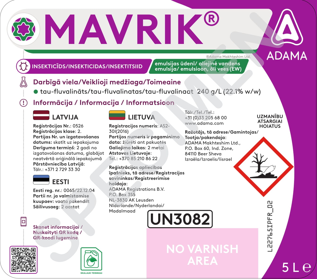 Mavrik® – kontaktinio veikimo insekticidas, skirtas naikinti graužiančius ir čiulpiančius kenkėjus žieminių ir vasarinių javų, žieminių ir vasarinių rapsų pasėliuose, rapsukuose, žirniuose, pupose, bulvėse, morkose, žiediniuose, gūžiniuose ir briuseliniuose kopūstuose, brokoliuose, linuose, dekoratyviniuose augaluose, taip pat eglučių sodinukuose.