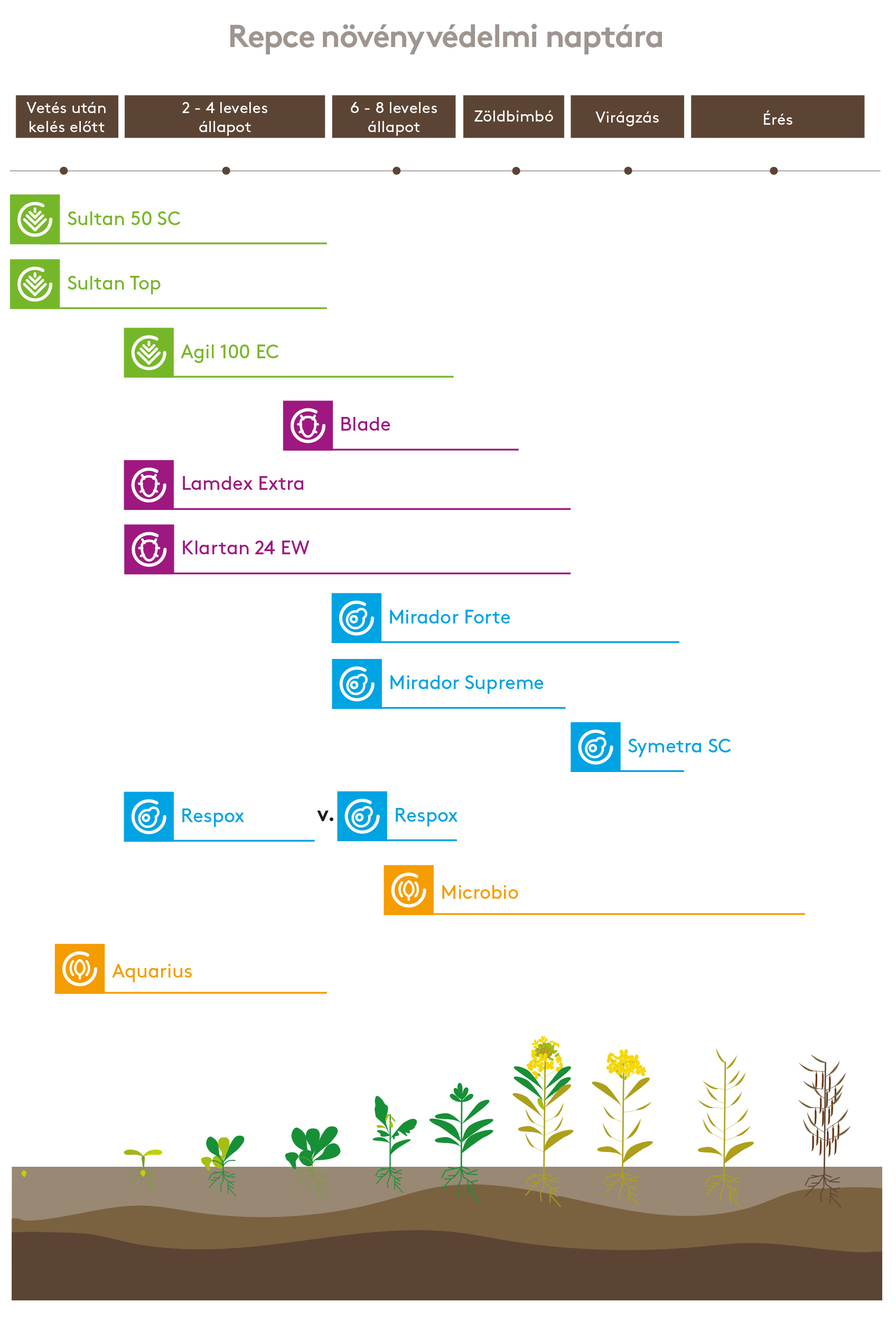 A MIRADOR SUPREME kitűnő hatékonyságú a repce kiemelten fontos betegségei ellen. Korai alkalmazás esetén növeli az elágazások számát. Zöldítő hatása révén pozitívan hat a termésképzésre, az olajtartalomra, valamint javítja a növény aszállyal szembeni ellenállóképességét. A RESPOX a repce növekedésszabályozási szegmensének kiemelkedő terméke, amely regulátor hatása mellett a gombabetegségek (fóma, alternária) ellen is hatékony. Szárbainduláskor a MIRADOR FORTE használatával csökkentjük a tavaszi betegségek fertőzésének veszélyét, emellett javul a szárszilárdság és több oldalhajtás képződik. A protiokonazol hatóanyagú PROCER 300 EC ősszel és tavasszal egyaránt használható, fertőzést megelőző és gyógyító hatással rendelkezik.