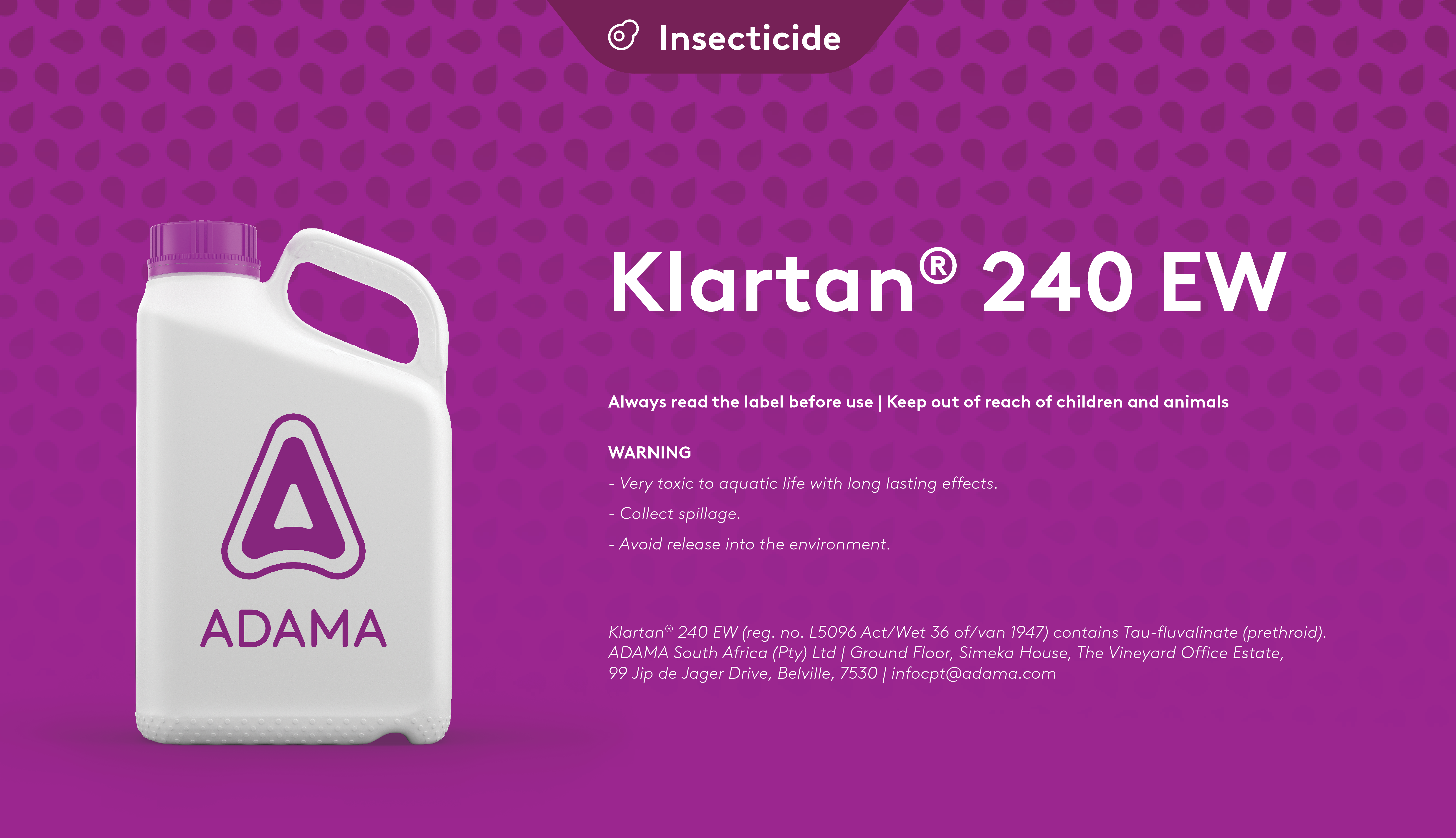 For Antestia bug, fruit nibbler, American bollworm and codling moth: Klartan® 240 EW (Reg. no. L5096 Act/Wet 36 of/van 1947) is a stomach and contact insecticide emulsion for the control of the following pests in pears: Antestia bug (Antestiopsis orbitalis), fruit nibbler (Prasoidea sericea), American bollworm (Helicoverpa armigera) and codling moth (Cydia pomonella). The active ingredient is tau-fluvalinate (pyrethroid). It comes with a warning as it is very toxic to aquatic life with long lasting effects. Avoid release to the environment and collect spillage. Always read the label before use.