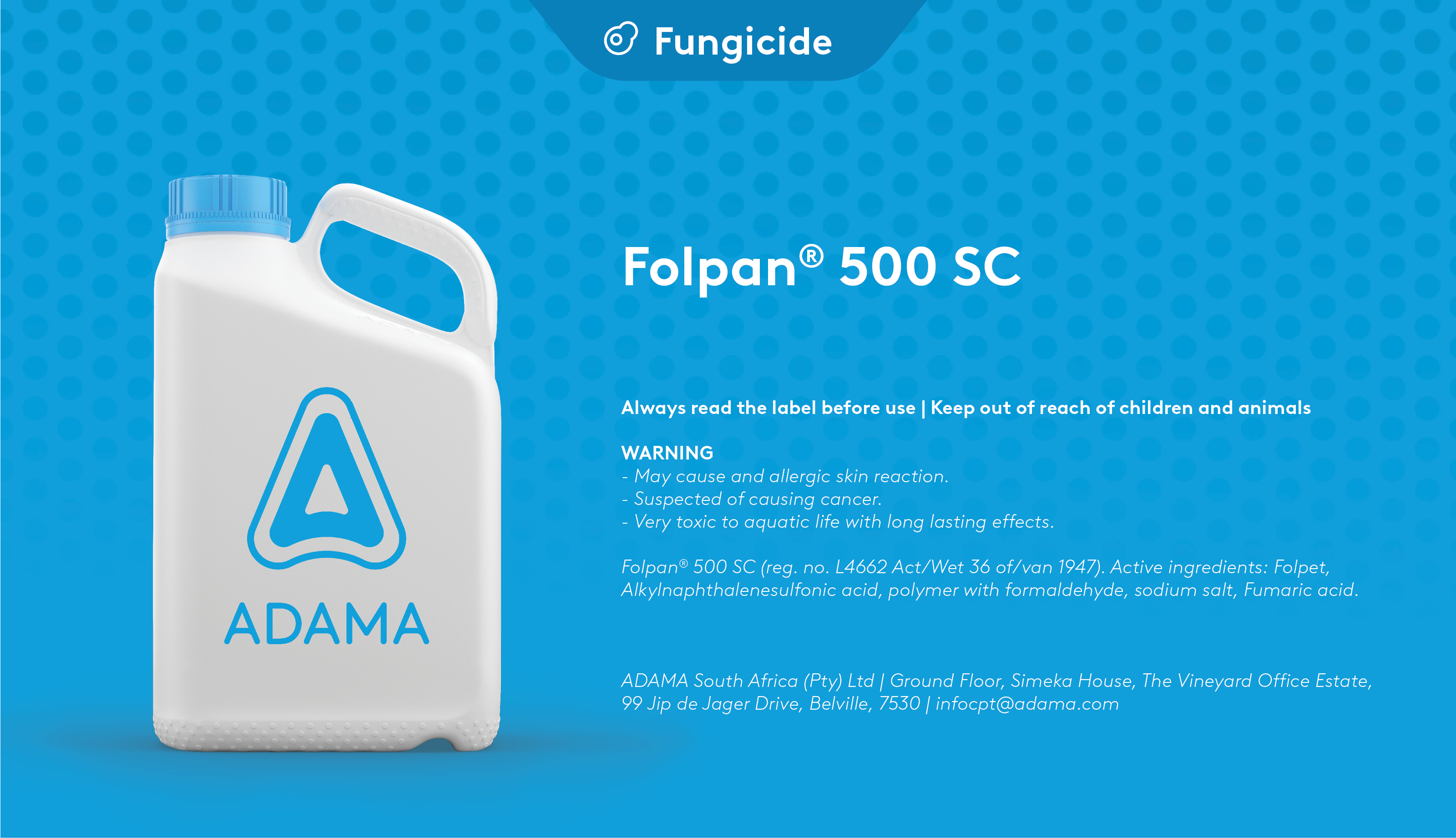 ADAMA’s Folpan® 500 SC (Reg. no. L4662 Act/Wet 36 of/van 1947) is a suspension concentrate, organic-based fungicide for the preventive control of downy mildew (Plasmopara viticola) in table and wine grapes; it also controls dead-arm disease and anthracnose in both, and Botrytis rot in wine grapes. The active ingredient is folpet and the product is classified in FRAC Group M04.
