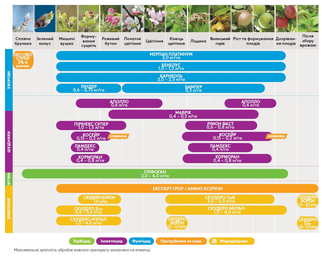 - Лідер у захисті яблуні проти парші, бурої плямистості та плодових гнилей.