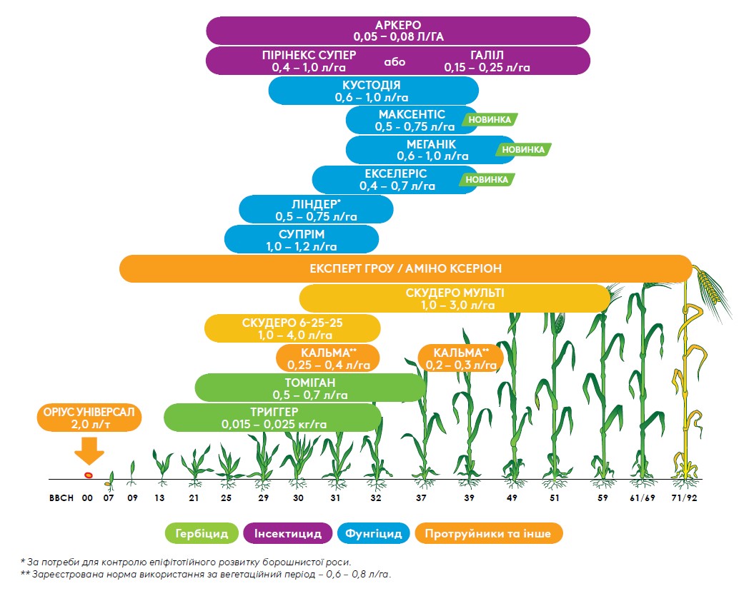 Схема захисту від бур’янів, хвороб, шкідників, продуктами ADAMA, а також застосування біостимуляторів та мікродобрив.
