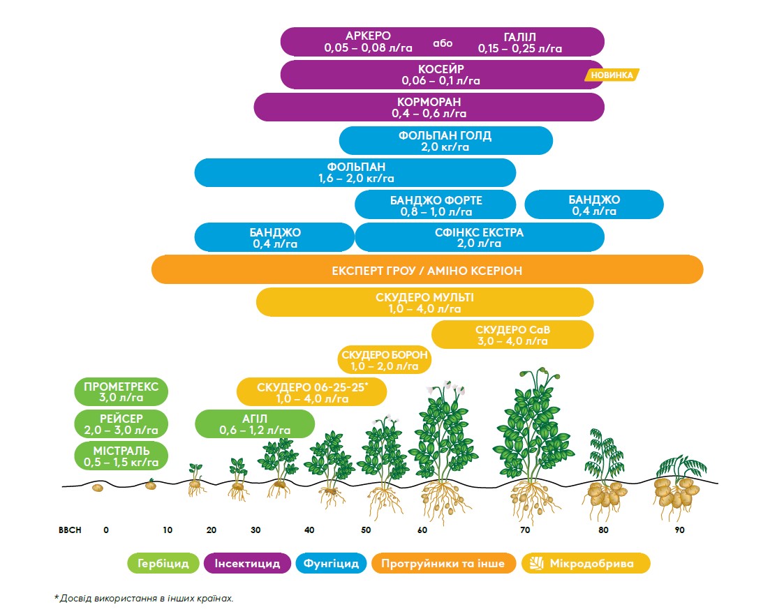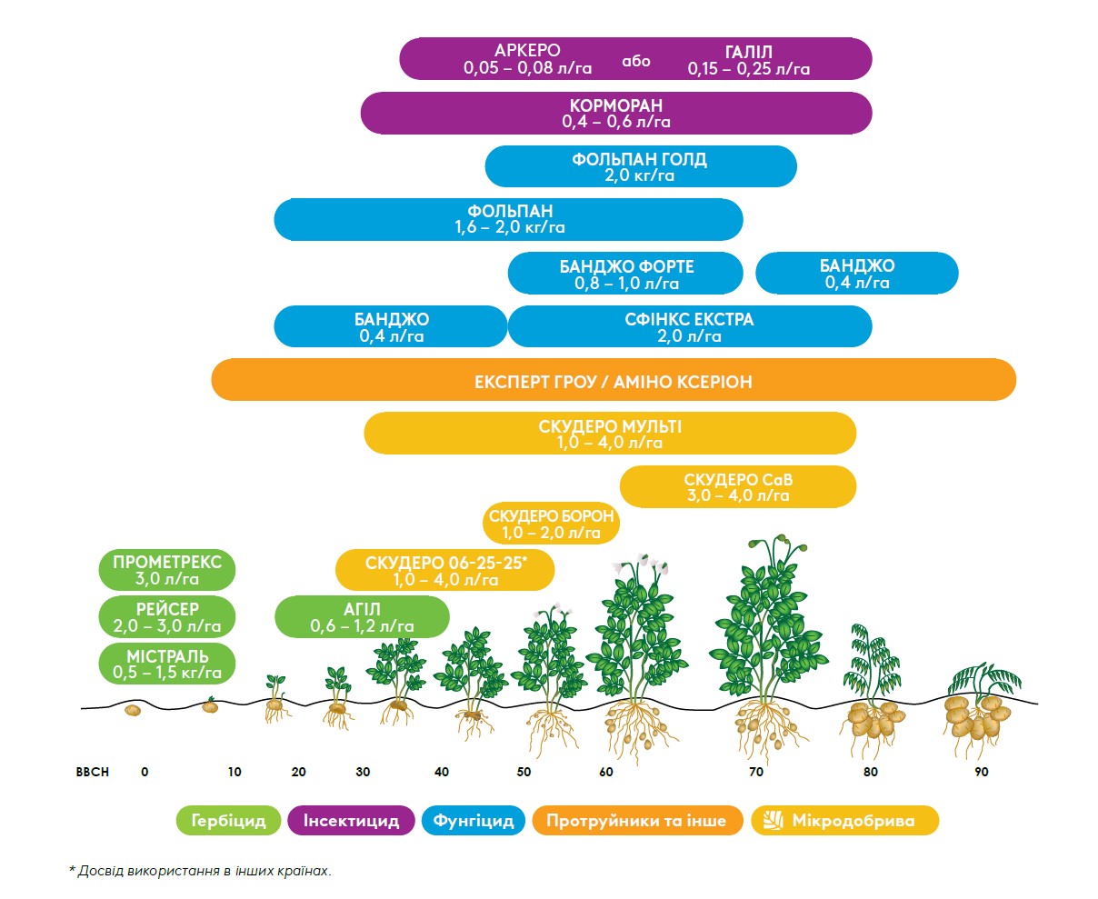 Схема захисту від бур’янів, хвороб, шкідників, продуктами ADAMA, а також застосування біостимуляторів та мікродобрив.