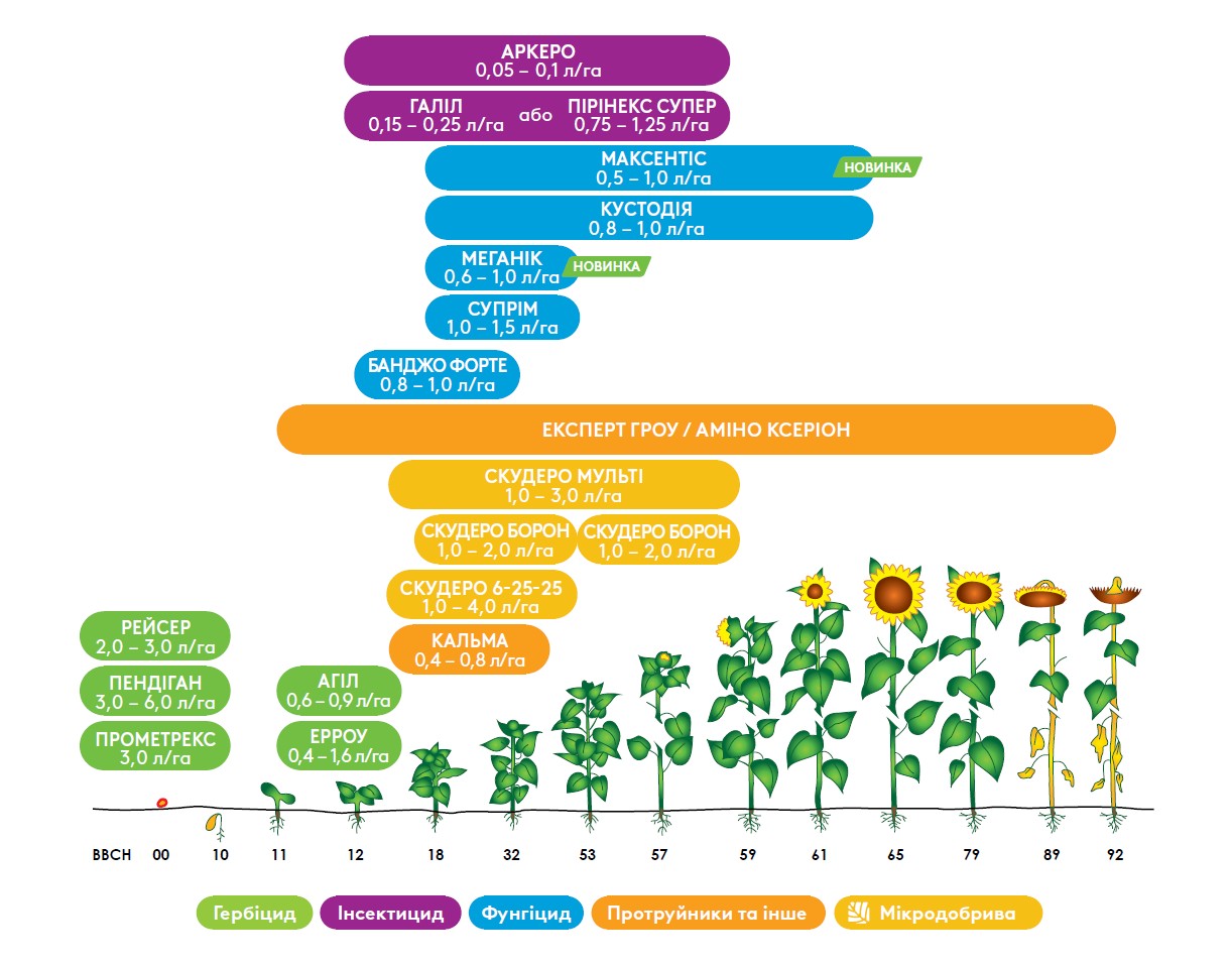 Схема захисту від бур’янів, хвороб, шкідників, продуктами ADAMA, а також застосування біостимуляторів та мікродобрив.