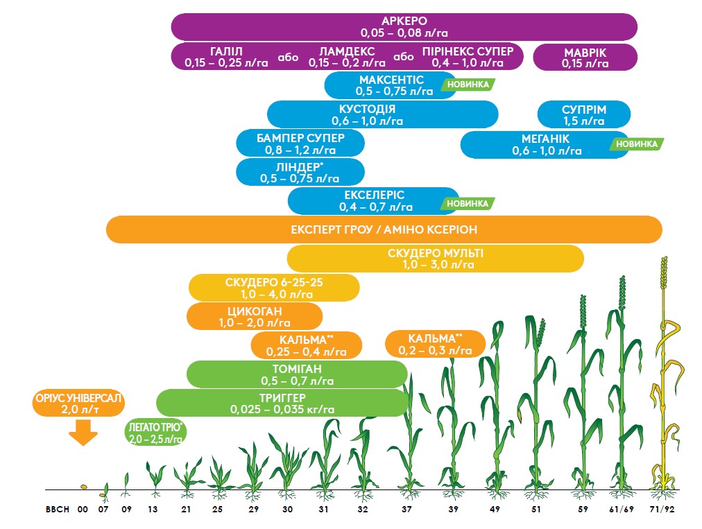 - Унікальний трьохкомпонентний післясходовий гербіцид для осіннього використання в посівах озимої пшениці.